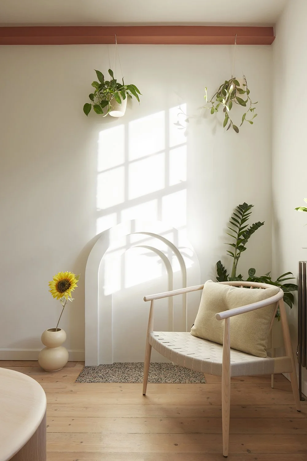 In the living room, an arched faux fireplace was installed, referencing the previous but focussing instead on the intriguing form to create shadow play. Steel beams are utilised functionally throughout to hang pot plants clad in sisal rope, picking up on the natural tones of the clay plaster and furniture.