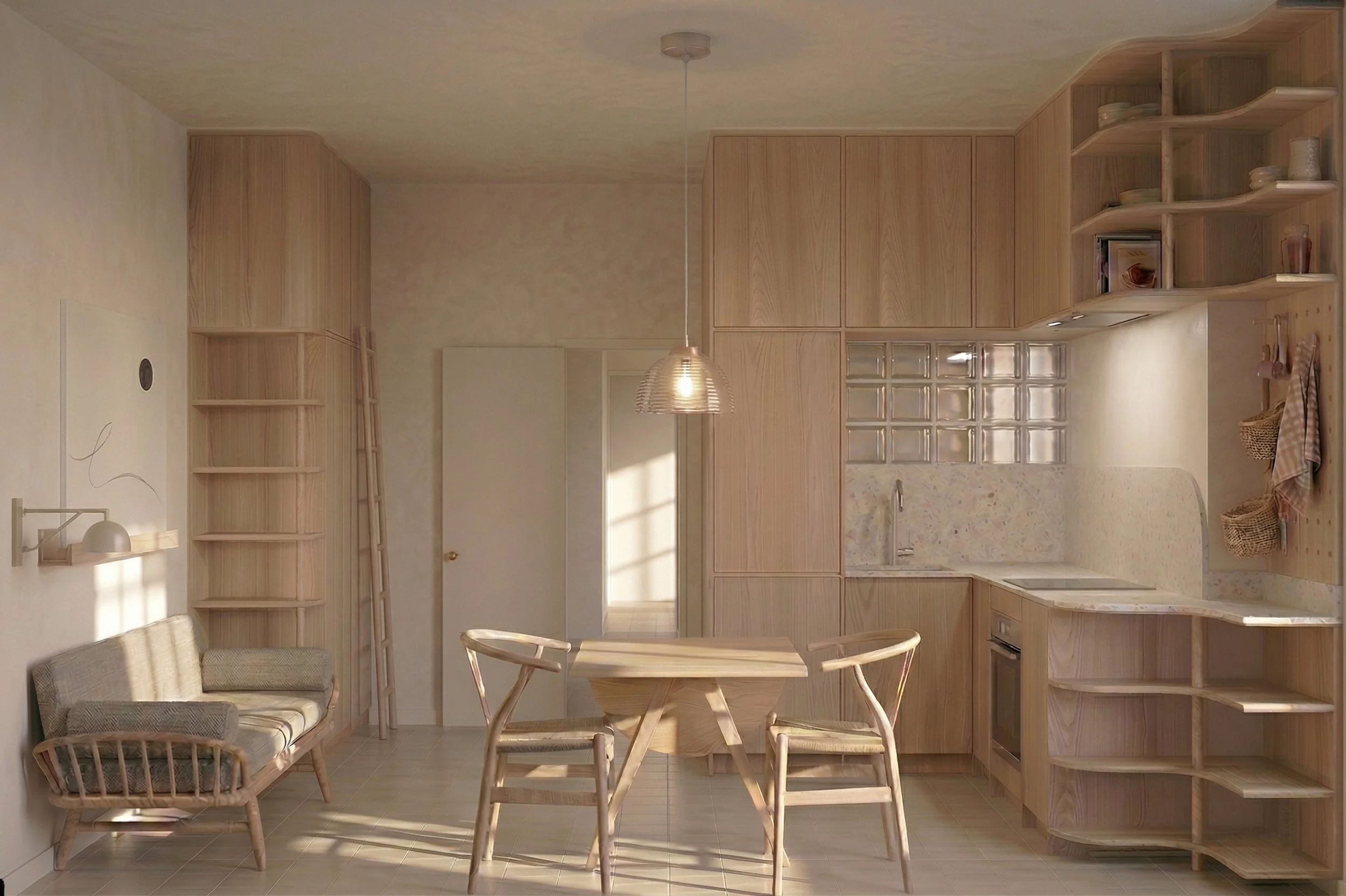 The brief was to turn a 36sqm one-bedroom flat into a flexible two-bedroom home and office for its owners, who wanted to be able to live, work and host in a small space.