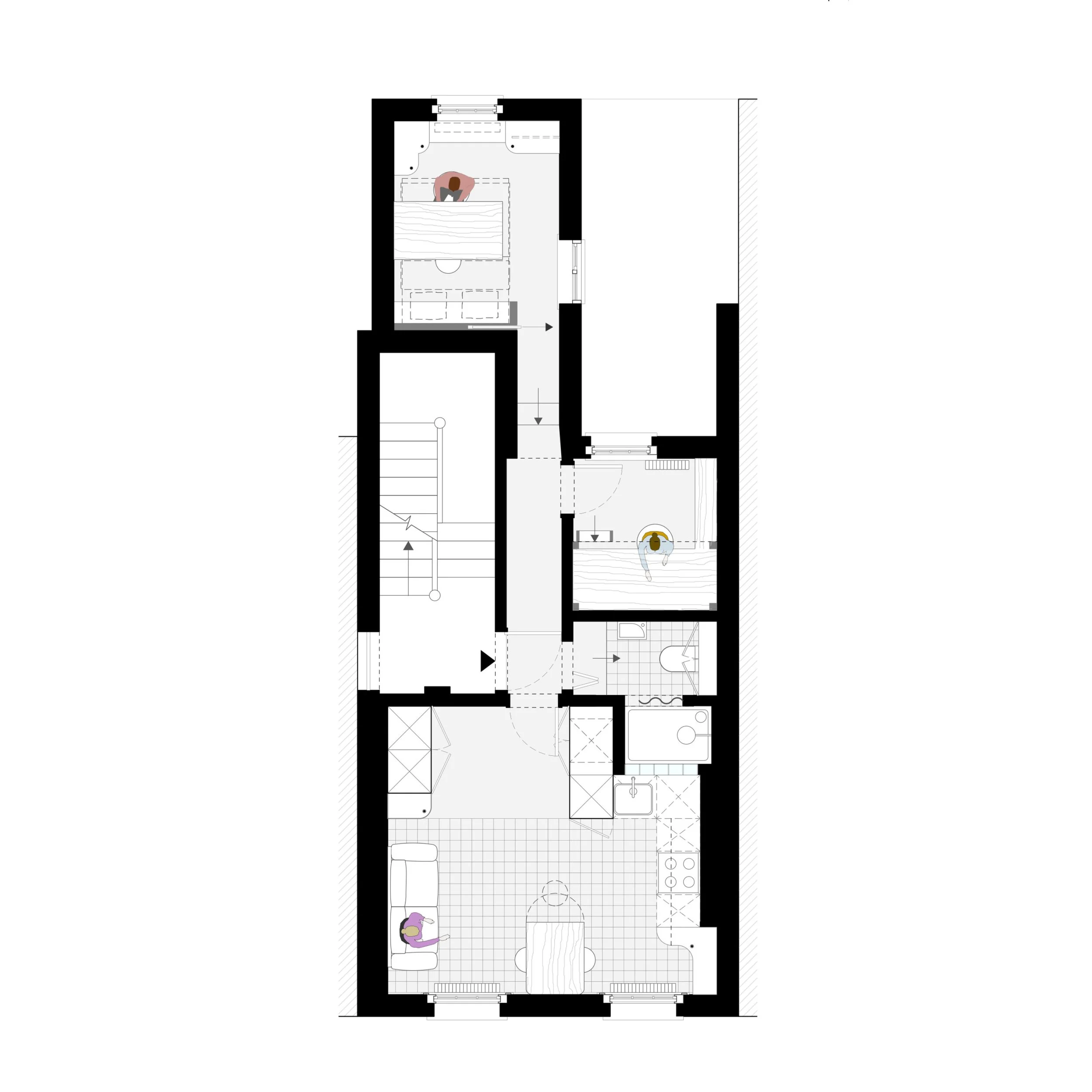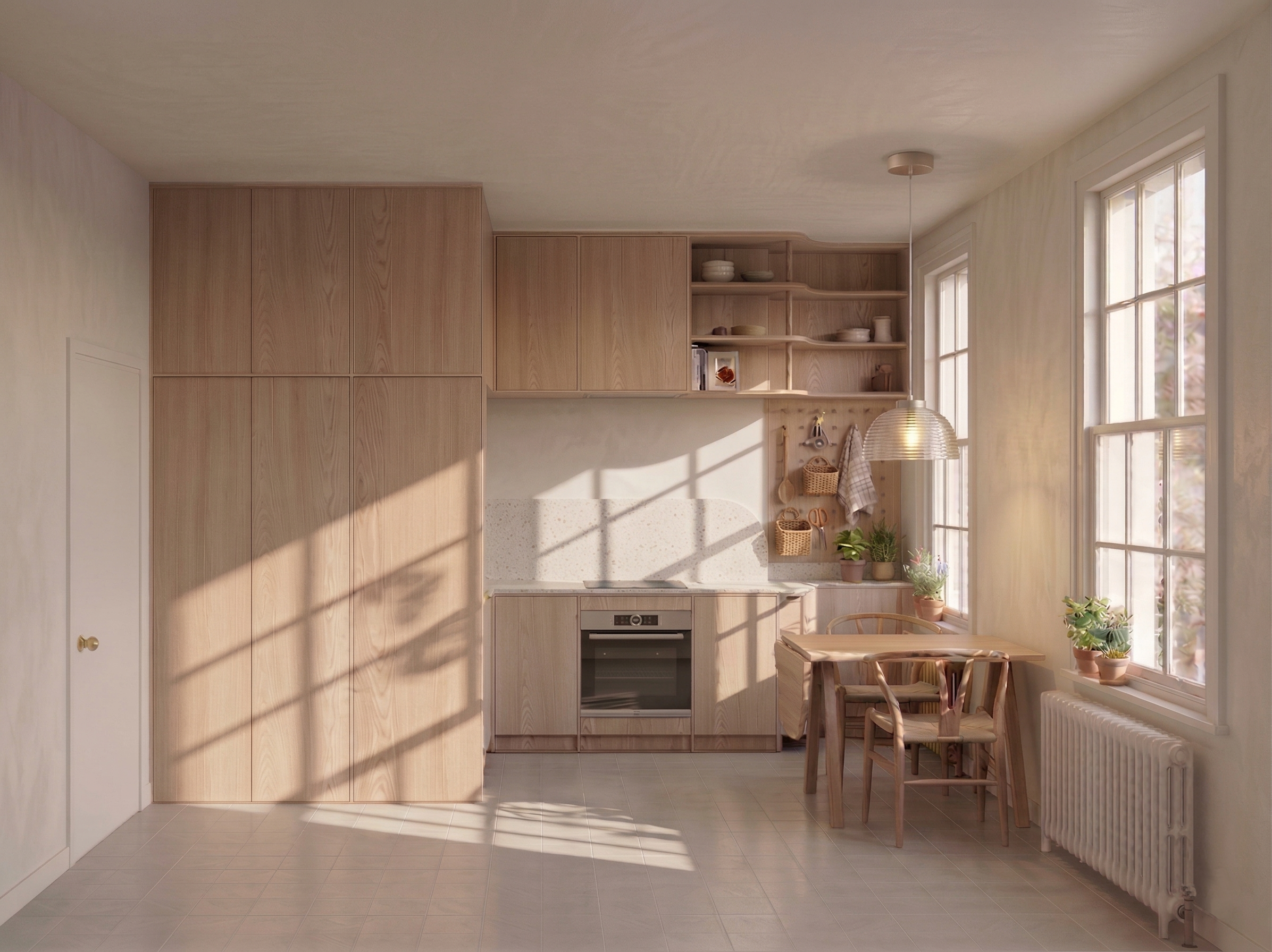 Layout changes included reclaiming a small area of the living room for a shower. This allowed for the relocation of the kitchen and bathroom, freeing up space for a second, naturally lit bedroom at the rear.